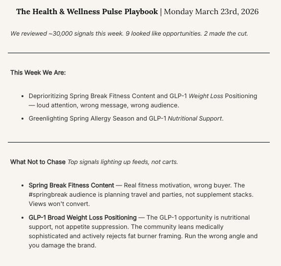Each week: Calls we're greenlighting backed by SKU-level commerce proof with full activation briefs across Social, TikTok Shop, Search, Amazon PDP, Retail Media, D2C, and Retention. Plus What Not to Chase — the signals that look real but won't convert.