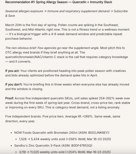 1. What do I get every Monday?A weekly intelligence email for each category you subscribe to. Each issue covers two to three greenlighted calls with SKU-level Amazon commerce proof and full activation briefs across Social, TikTok Shop, Search, Amazon PDP, Retail Media, D2C, and Retention — plus one to two What Not to Chase entries explaining which high-volume signals won't convert and why. The calls are ready to brief directly. No translation required.