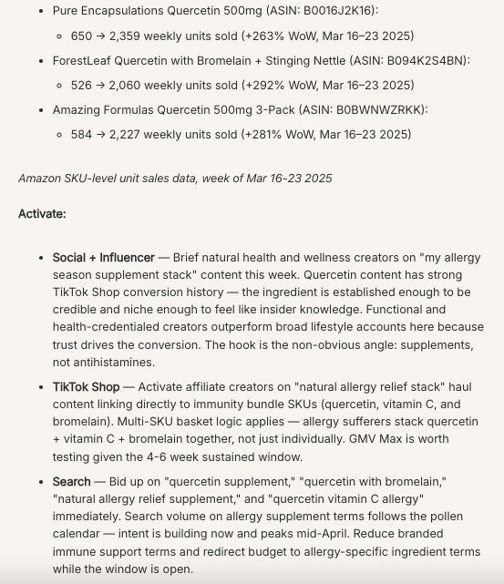 3. How is this different from trend reports and dashboards?Trend reports tell you what's getting attention. Dashboards tell you what already happened. The Pulse Playbook tells you what's converting right now, validates each call against SKU-level Amazon unit sales data, and tells you exactly how to activate against it before the window closes. The What Not to Chase section is the part you can't get anywhere else — it requires knowing why a signal that looks like a commerce opportunity structurally isn't one. That takes category knowledge, not a data feed.